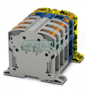 Клемма для высокого тока, блокированный, Тип подключения: Зажим Power-Turn, Количество точек подключения: 8, Полюсов: 4, Сечение: 50 мм² - 150 мм², AWG: 1/0 - 300 kcmil, Ширина: 31 мм, Высота: 108,3 мм, Цвет: серый/синий, Тип монтажа: Непосредственное резьбовое