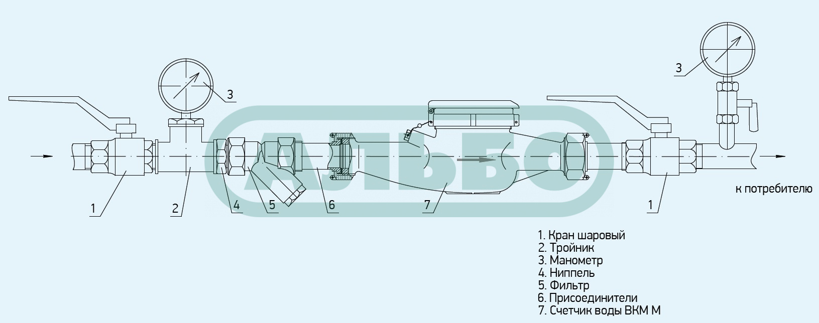 Счетчик (общедомовой) крыльчатый мокроходный многоструйный холодной воды ВКМ-25М ДГ «РОСИЧ» с импульсным выходом. Комплект присоединительных частей.