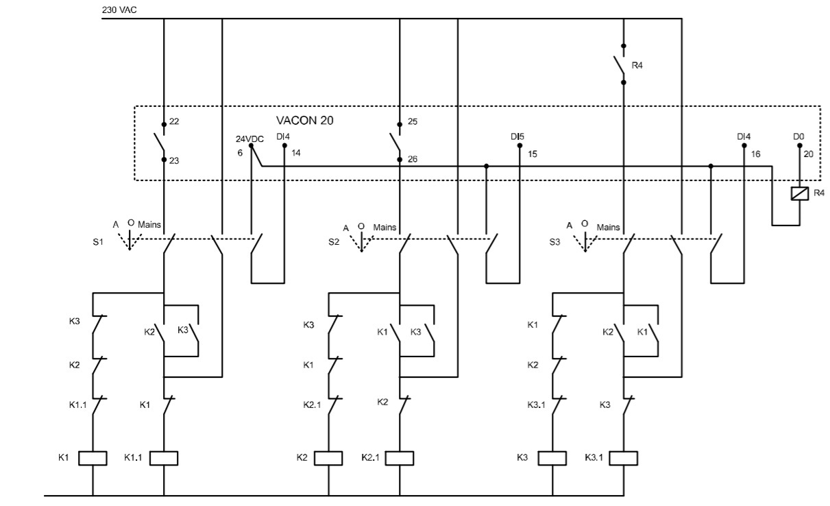 23.01.2020 Предлагаемое решение позволяет на базе одного частотного преобразователя Vacon 20 управлять несколькими электродвигателями насосов или вентиляторов (до 3-х).