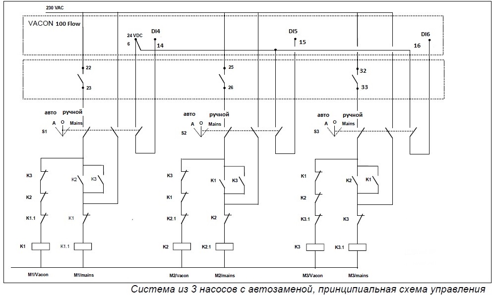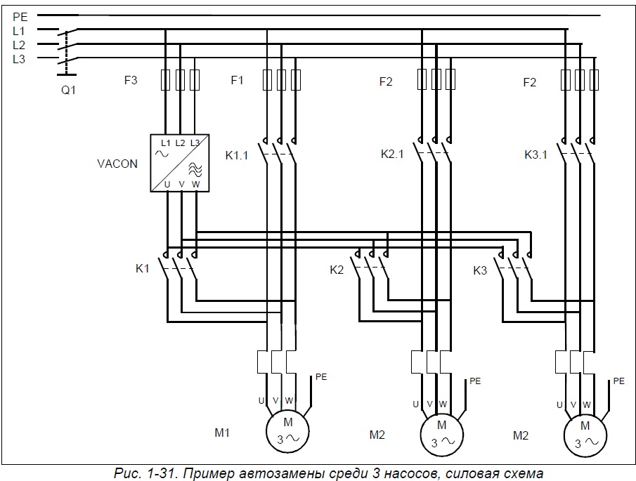 Предлагаемое решение позволяет на базе одного частотного преобразователя Vacon 100 Flow управлять несколькими электродвигателями (до 8-ми).
