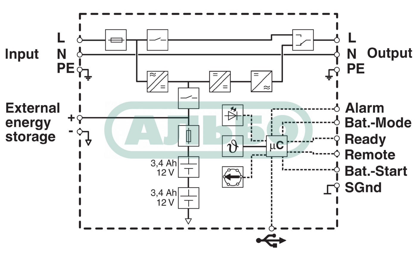 Источник бесперебойного питания 1AC/1AC/750 ВА со встроенным энергоаккумулятором, свинцово-кислотный, технология VRLA, 24 DC, 3,4 А-ч для систем 230 В AC.