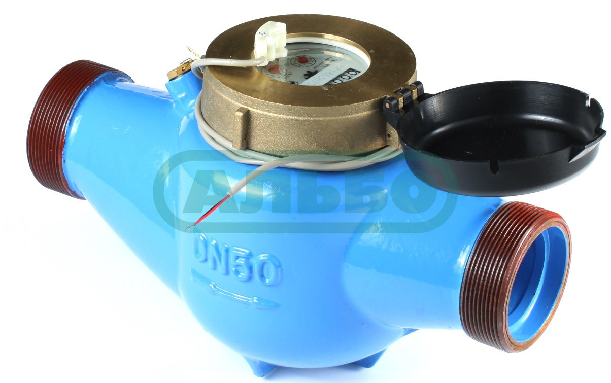 Общедомовой счетчик для воды (только холодная) в исполнении: крыльчатый мокроходный многоструйный ВКМ-50М ДГ «РОСИЧ» с импульсным выходом в комплекте с присоединительными частями под резьбу.