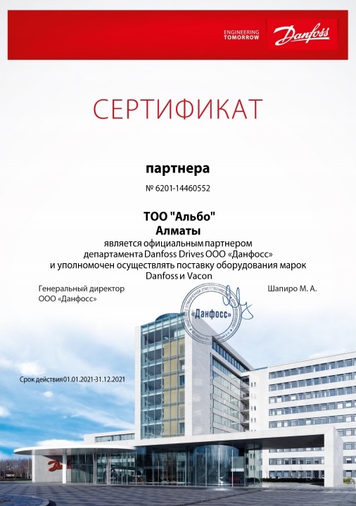 Сертификат партнера Danfoss Drives (VLT® & Vacon®) Albo 2022