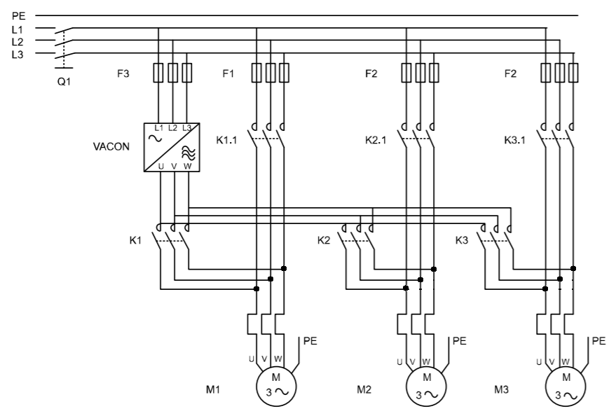 23.01.2020 Предлагаемое решение позволяет на базе одного частотного преобразователя Vacon 20 управлять несколькими электродвигателями насосов или вентиляторов (до 3-х).