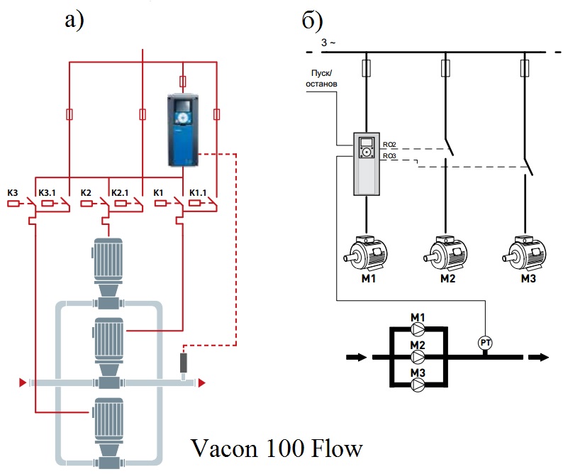 Предлагаемое решение позволяет на базе одного частотного преобразователя Vacon 100 Flow управлять несколькими электродвигателями (до 8-ми).